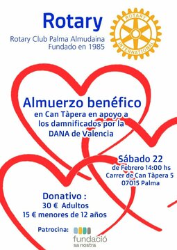 El Rotary Club Palma Almudaina organiza un almuerzo benéfico en apoyo a los damnificados por la DANA de Valencia. El evento se llevará a cabo el sábado 22 de febrero a las 14:00 hs en Can Tàpera, ubicado en Carrer de Can Tàpera 5, 07015 Palma.