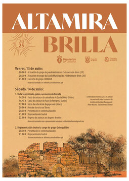 "Altamira Brilla" regresa para celebrar a súa cuarta edición cun amplo programa de actividades divididos en dous días que inclúe o concerto do grupo CARMELA, unha ruta teatralizada polos escenarios mais significativos da Batalla e representación teatral a cargo do grupo Os Quinquilláns. Todo no impresionante marco escénico que conforman as Torres de Altamira, no lugar de A Torre (Brión).