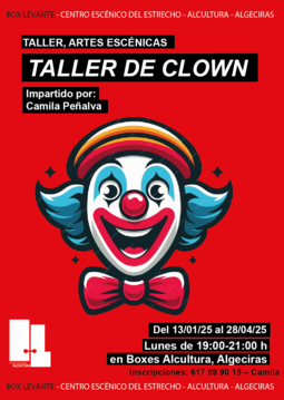 Taller trimestral de clown dirigido a adultos y adolescentes. El taller tendrá lugar cada lunes de 19:00 h a 21:00 h desde el 13 de enero de 2025 hasta el 28 de abril de 2025 en Box Levante, Boxes Alcultura, Algeciras.